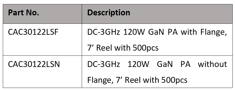 CAC30122L is a 120W(P3dB) unmatched GaN power amplifier. It operates perfectly from DC to 3GHz with 28 volts rail, offers a general purpose, broadband, high power and high efficiency wireless pulse or CW communication application.