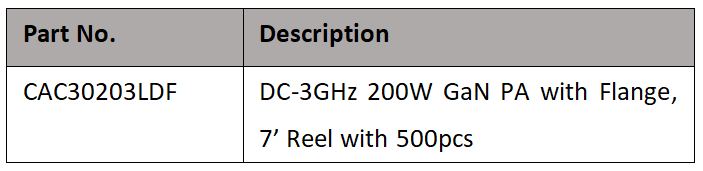 CAC30203L is a 200W(P3dB) internally matched GaN power amplifier. It operates perfectly from DC to 3GHz with 28 volts rail, offers a general purpose, broadband, high power and high efficiency wireless pulse or CW communication application.
