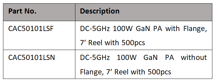 CAC50101L is a 100W(P5dB) input pre-matched GaN power amplifier. It operates perfectly from DC to 5GHz with 28 volts rail, offers a general purpose, broadband, high power and high efficiency wireless pulse or CW wideband communication application.