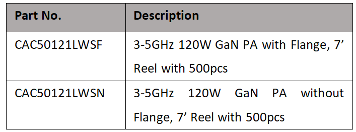 CAC50121LW is a 120W(P5dB) input pre-matched GaN power amplifier. It operates perfectly from 3 to 5GHz with 28 volts rail, offers a general purpose, broadband, high power and high efficiency wireless pulse or CW wideband communication application.