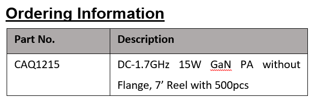 CAQ1215 is a 15W GaN power amplifier with input matching circuits. It operates DC-1700MHz with 28 volts rail, offers a general purpose, broadband, high power level and high efficiency wireless communication application.