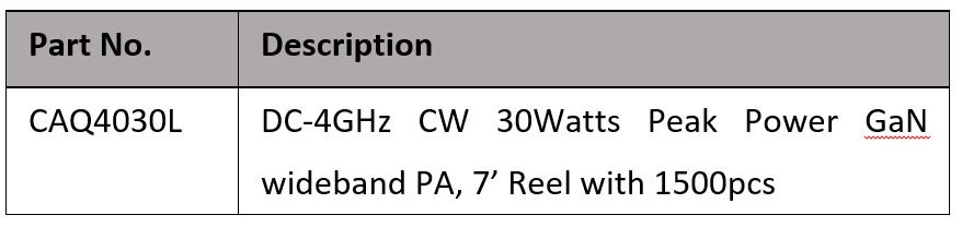 CAQ4031L is a 30W(P3dB) unmatched GaN power amplifier. It operates from DC to 4GHz with 28 volt rail, offers a general purpose, broadband, high power and high efficiency wireless pulse and CW communication application.